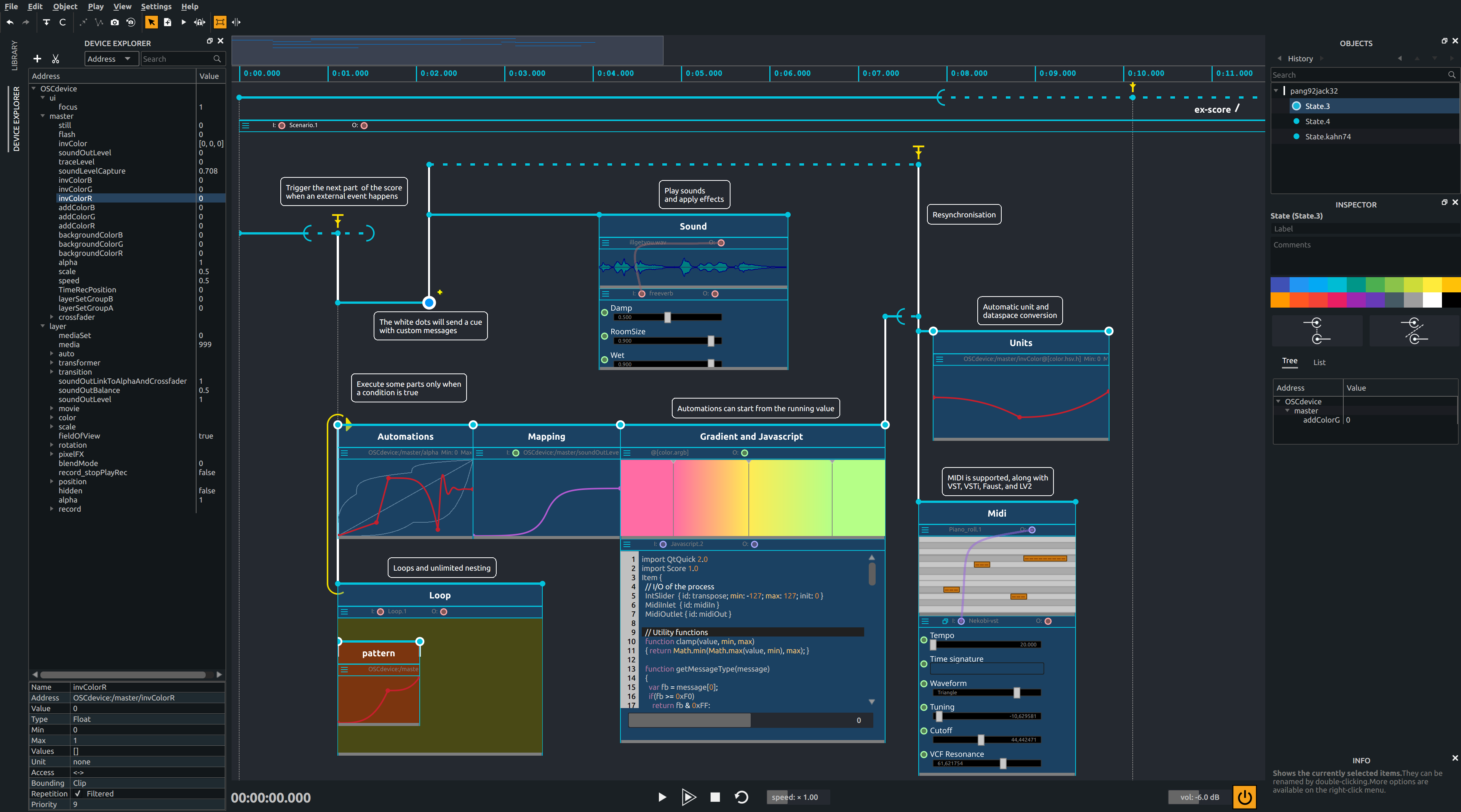 ) principale des objets soit temporels (que l'on appelle des processus), soit instantanés (que l'on appelle des états).Les objets temporels peuvent être par exemple des courbes d'automations, des scripts écrits en JavaScript, des mappings, des dégradés de couleur, des piano-roll midi et autres ; de nouveaux processus peuvent être introduits via un système de plug-ins.