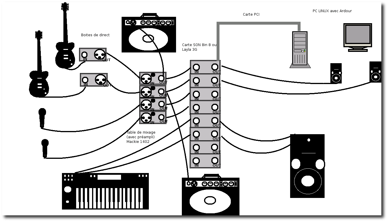 L'image ci-desus a été faite avec Dia et une extension musicale. Elle doit vous permettre de vérifier que toutes les sorties sont audibles et ne seront pas ralenties par l'enregistrement sous Ardour 3.