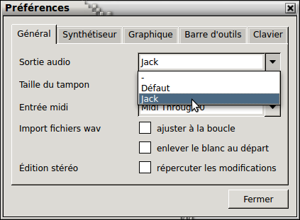 Polyphone est compatible avec JACK, l'utilisation de ce serveur étant à renseigner dans les préférences (menu Édition -> Préférences) : dans l'onglet Général sélectionner la Sortie audio. Pour prendre en compte les changements, il faut relancer l'application, Polyphone connecte alors automatiquement ses sorties son.