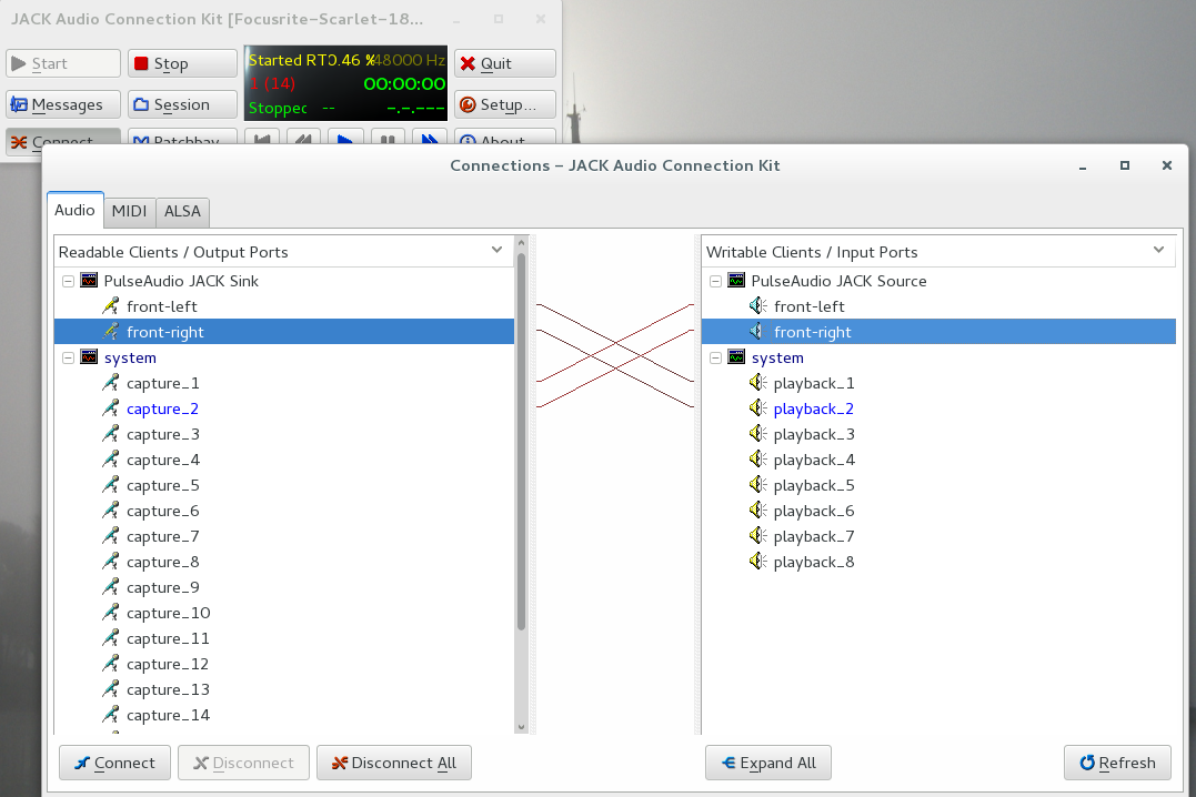 QjackCtrl permet de vérifier que les entrées/sorties de PulseAudio sont bien connectées sur les entrées/sorties jack correspondant à votre carte. Par défaut il fait la connexion sur les deux premiers canaux, ce qui en général est plutôt une bonne idées. Mais si votre carte à 18 entrées et 8 sorties comme la mienne Scarlett 18i8 alors il est possible d’avoir à modifier le schéma des connexions.