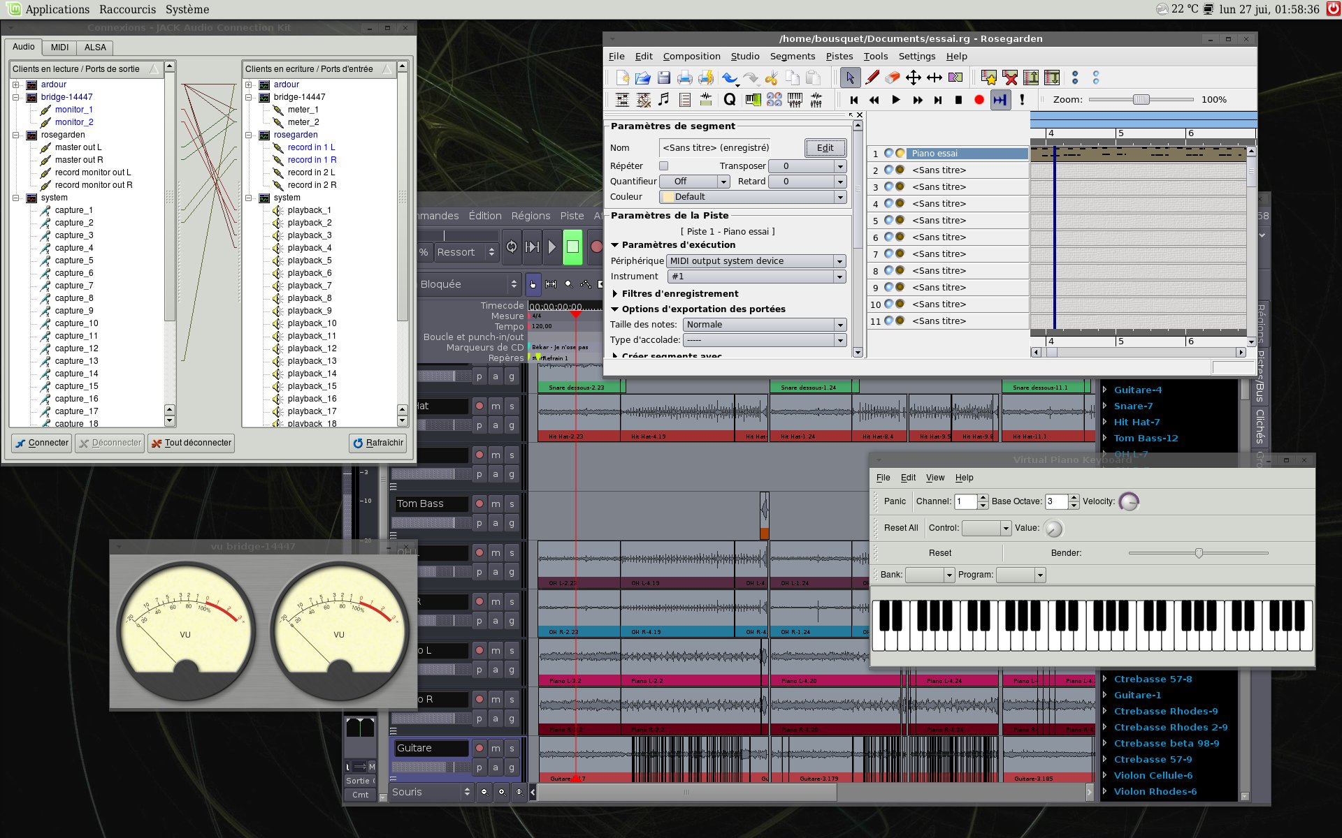 Je précise que je fais rarement d'enregistrement comme cela... Ceci dit, avec les logiciels les plus réputés dans le monde de la MAO sous GNU/Linux, je n'ai jamais eu aucun souci... que ce soit hydrogen, Zynaddsubfx... Pour ce qui est de Rosegarden, pour l'avoir utilisé plusieurs fois, cela fonctionne très bien...