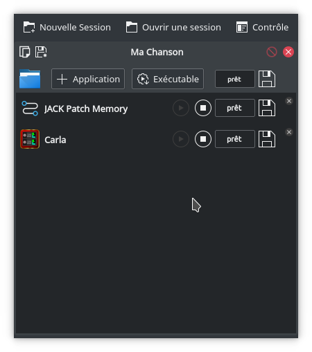 Vous remarquerez que le programme se lance, et qu'un nouvel élément de liste apparaît dans la fenêtre principale de Ray Session, avec de gauche à droite: l'icône de l'application, le nom de l'application (ici "Carla"), un bouton Lancer, un bouton Stop, le statut de l'application, un bouton de sauvegarde, et un bouton de suppression.