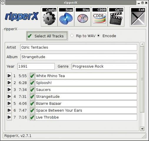 RipperX permet de ripper vos CD audio dans plusieurs formats depuis une interface graphique simple et intuitive. Le soft utilise l'outil en ligne de commande cdparanoia pour ripper les CD et permet aussi de télécharger les informations du CD depuis le site CDDB.