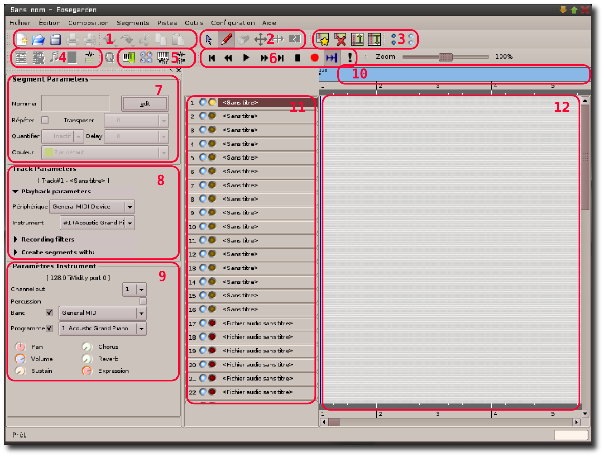 Le morceau se compose de plusieurs pistes qui représentent un instrument (c'est-à-dire un périphérique midi ou une piste son "classique" enregistrée). Chaque instrument n'étant pas obligé de jouer tout au long du morceau, une piste est constituée d'un ou plusieurs segments (les parties jouées). Les segments peuvent être écrits manuellement, ou enregistrés. Les commandes de la zone "2" sur la capture ci-dessus vous permettent de réaliser les opérations classiques sur les segments (création, déplacement, etc.).Exemples fournis