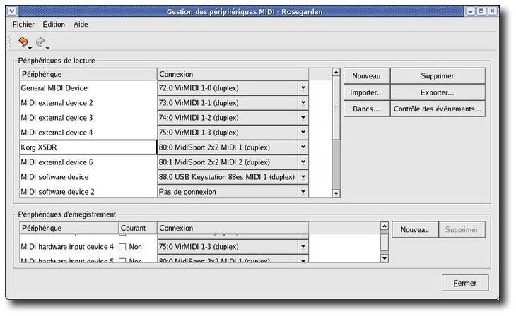 Les périphériques de lecture correspondent aux synthétiseurs ou autres appareils branchés sur vos sorties MIDI out. Vous pouvez importer des définitions de synthétiseurs courants en sélectionnant le périphérique concerné et en cliquant sur le bouton importer ; je l'ai fait pour mon expandeur Korg X5DR, dont le fichier de description est inclus dans la distribution de Rosegarden. Si votre matériel n'est pas reconnu, vous pouvez créer une description ; pour cela, cliquez sur Bancs et Contrôle des évènements, puis Exporter pour sauvegarder. Les synthés logiciels - lecteurs de soundfont (timidity, qsynth, etc.) ou synthétiseurs (timidity, qsynth, ou zynadd et hydrogen, etc.) apparaissent également ici. Il est à noter que dans certains cas, pour pouvoir voir ZynAddSubFx dans le gestionnaire de périphériques de Rosegarden, avant de lancer Rosegarden, dans ZynAddSubFx, il faut passer par File/NioSettings, laisser Audio sur Jack et passer Midi sur Alsa. Ensuite, on peut lancer Rosegarden en ayant pris soin de créer les liens nécessaires entre ZynAddSubFx et Rosegarden, dans Jack.