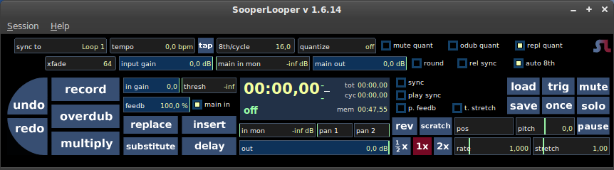 Pour ajouter une nouvelle boucle, allez dans le menu "Session" et choisissez "Add mono loop" (Ajouter une boucle mono) ou "Add stereo loop" (Ajouter une boucle stéréo). Une nouvelle boucle apparait alors dans la fenêtre de SooperLooper :