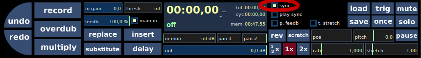 - substitute comme replace, mais la boucle effacée est jouée en même temps. Le lancement/arrêt de l'enregistrement est synchronisé, ou non, suivant sync to et quantize.