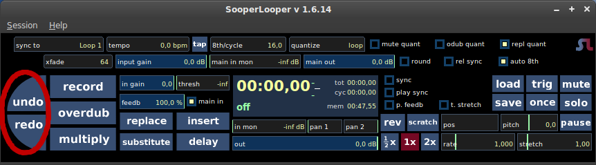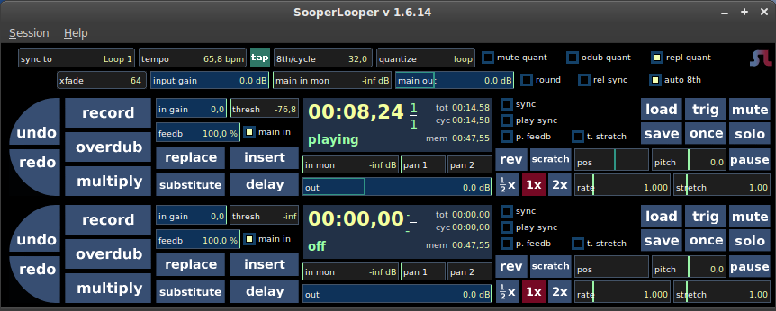 Cela pourrai être une autre boucle, un tempo interne ("Intern", paramétrable dans la case tempo), un métronome externe ("MidiClock"), une synchronisation au transport de jack ("Jack/Host"), ou aucune ("None"). - "quantize = loop" - les actions/opération seront déclanchées à chaque départ de la boucle.