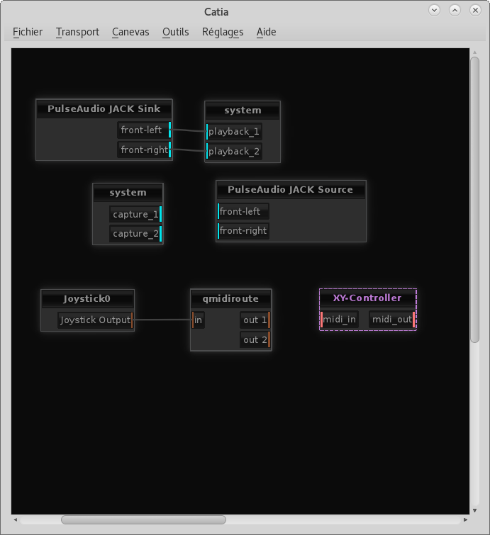 5. Via l'interface graphique de JACK de votre choix, ici c'est Catia, patchez aseqjoy, qui apparaît sous le nom joystick0, à Qmidiroute.