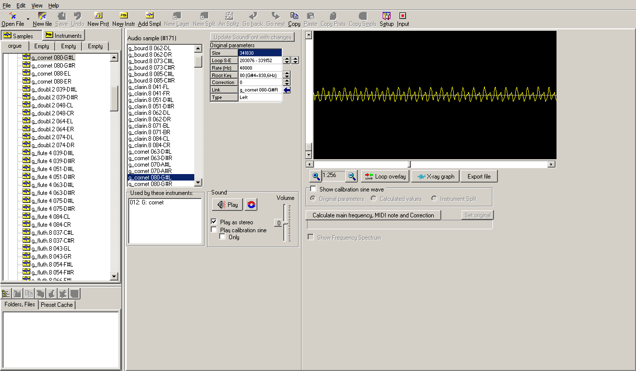 La partie droite du logiciel est à utiliser si des boucles sont à réaliser sur les échantillons (pour faire durer le son indéfiniment à partir d'un petit enregistrement). Le graphe permet de visualiser l'onde sonore, un clic gauche dessus placera le début de la boucle, un clic droit placera la fin. Les valeurs de début et de fin peuvent être éditer manuellement à l'aide du champ éditable situé à droite de "loop S-E". Pour chaque échantillon ajoutée, il est préférable de lui assigner sa position sur le clavier, à droite de "root key". Il est également possible d'accorder le échantillon.