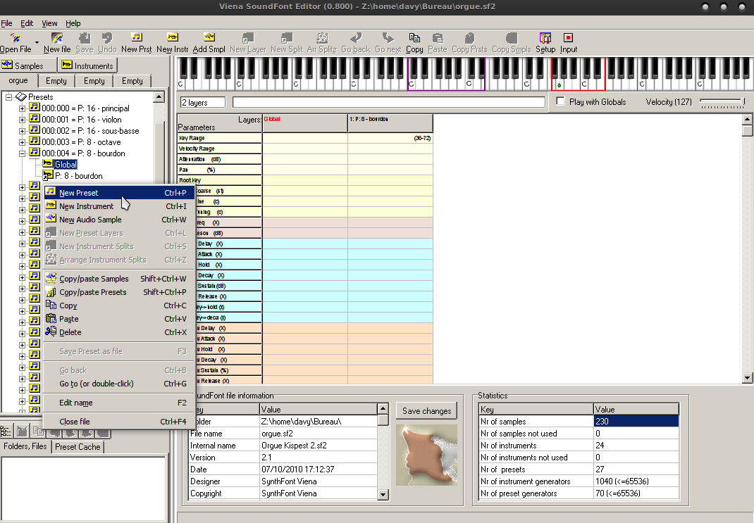 Clic droit sur l'arborescence, puis "New Preset".Le préréglages correspond à ce que l'on entend réellement. Si on ne veut entendre qu'un instrument, le prérégalge ne contiendra qu'un instrument. Mais si on veut entendre un plein jeu pour l'orgue par exemple, à partir de la définition de tous les jeux, alors le préréglage contiendra beaucoup plus qu'un instrument : fonds de 16, de 8, de 4, doublette 2, fourniture, ...