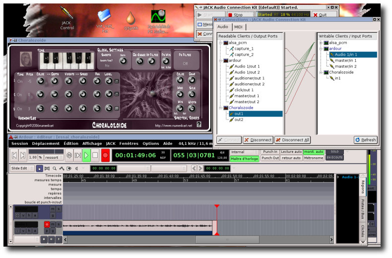 Le VST (Choralozoide) est donc connecté en entrée (insert) sur Ardour 2 béta 11. Encore une fois, les connexions sont très facile avec QJackCtl. Le niveau d'entrée ne doit pas trop faible (réglable via alsamixer).