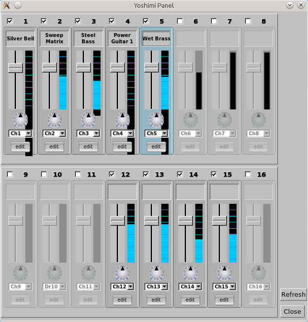 Le panel permet d'attacher un instrument à chacun des 16 canaux MIDI.