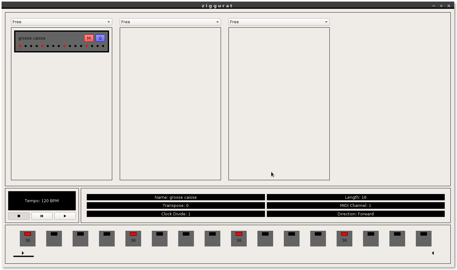 Ziggurat est un séquenceur à pas (Step Sequencer) MIDI conçu pour le jeu en direct. Il reproduit au niveau graphique et ergonomique les séquenceurs/synthétiseurs matériels. Il présente 3 colonnes dans lesquelles on crée des séquences que l'on peut nommer et éditer, on peut choisir le nombre de pas (16 par défaut), le canal MIDI, la direction de lecture et on dispose d'une fonction de transposition ainsi que le choix de l'horloge.