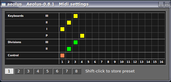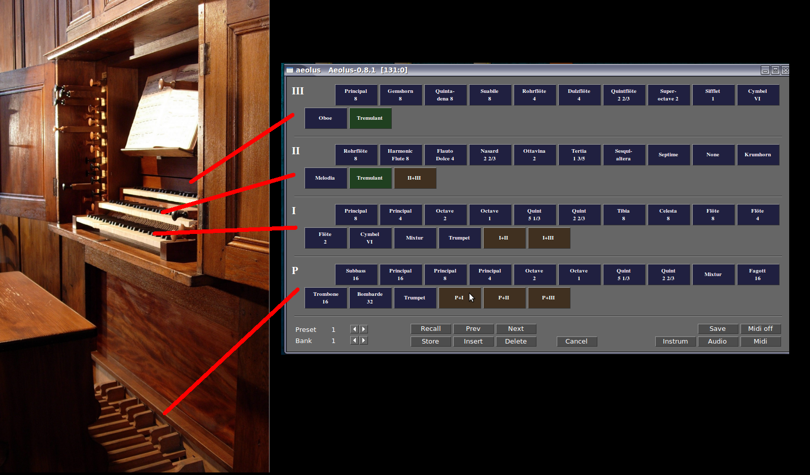 Aeolus possède 2 orgues alternatifs, pour les utiliser, il faut lancer Aeolus depuis une console en utilisant l'option -I :
