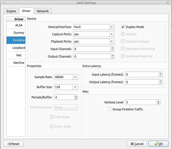 totof@stationprincipale:~$ ffado-diag FFADO diagnostic utility 2.4.1 (C) 2008 Pieter Palmers 2009-2010 Arnold Krille 2018 Nicolas Boulenguez, Jonathan Woithe gcc /usr/bin/gcc gcc (Debian 8.3.0-6) 8.3.0 g++ /usr/bin/g++ g++ (Debian 8.3.0-6) 8.3.0 pyuic4 None pyuic5 None jackd /usr/bin/jackd jackdmp version 1.9.12 tmpdir /dev/shm protocol 8 pkg-config /usr/bin/pkg-config jack not found libraw1394 not found libavc1394 not found libiec61883 not found libxml++-2.6 not found dbus-1 not found Build time info /usr/lib/x86_64-linux-gnu/libffado/static_info.txt gcc /usr/bin/gcc gcc (Debian 7.3.0-17) 7.3.0 g++ /usr/bin/g++ g++ (Debian 7.3.0-17) 7.3.0 pyuic4 None pyuic5 /usr/bin/pyuic5 Python User Interface Compiler 5.10.1 for Qt version 5.10.1 jackd None pkg-config /usr/bin/pkg-config jack not found libraw1394 2.1.2 -lraw1394 libavc1394 not found libiec61883 1.2.0 -liec61883 -lraw1394 libxml++-2.6 2.40.1 -I/usr/include/libxml++-2.6 -I/usr/lib/x86_64-linux-gnu/libxml++-2.6/include -I/usr/include/libxml2 -I/usr/include/glibmm-2.4 -I/usr/lib/x86_64-linux-gnu/glibmm-2.4/include -I/usr/include/glib-2.0 -I/usr/lib/x86_64-linux-gnu/glib-2.0/include -I/usr/include/sigc++-2.0 -I/usr/lib/x86_64-linux-gnu/sigc++-2.0/include -lxml++-2.6 -lxml2 -lglibmm-2.4 -lgobject-2.0 -lglib-2.0 -lsigc-2.0 dbus-1 1.12.8 -I/usr/include/dbus-1.0 -I/usr/lib/x86_64-linux-gnu/dbus-1.0/include -ldbus-1 kernel version 4.19.0-11-amd64 Preempt (low latency) False RT patched False /dev/fw* ['/dev/fw1', '/dev/fw0'] crw------- 1 root root 246, 0 Sep 26 15:38 /dev/fw0 crw-rw----+ 1 root audio 246, 1 Sep 26 15:38 /dev/fw1 User IDs uid=1000(totof) gid=1000(totof) groups=1000(totof),24(cdrom),25(floppy),29(audio),30(dip),44(video),46(plugdev),109(netdev),114(lpadmin),115(scanner) uname -a Linux stationprincipale 4.19.0-11-amd64 #1 SMP Debian 4.19.146-1 (2020-09-17) x86_64 GNU/Linux lspci /usr/bin/lspci 04:00.0 FireWire (IEEE 1394) [0c00]: VIA Technologies, Inc. VT6306/7/8 [Fire II(M)] IEEE 1394 OHCI Controller [1106:3044] (rev 80) (prog-if 10 [OHCI]) Subsystem: VIA Technologies, Inc. VT6306/7/8 [Fire II(M)] IEEE 1394 OHCI Controller [1106:3044] Control: I/O+ Mem+ BusMaster+ SpecCycle- MemWINV- VGASnoop- ParErr- Stepping+ SERR+ FastB2B- DisINTx- Status: Cap+ 66MHz- UDF- FastB2B- ParErr- DEVSEL=medium >TAbort- <TAbort- <MAbort- >SERR- <PERR- INTx- Latency: 64 (8000ns max), Cache Line Size: 32 bytes Interrupt: pin A routed to IRQ 19 Region 0: Memory at f7200000 (32-bit, non-prefetchable) [size=2K] Region 1: I/O ports at d000 [size=128] Capabilities: <access denied> Kernel driver in use: firewire_ohci Kernel modules: firewire_ohci lscpu /usr/bin/lscpu Architecture: x86_64 CPU op-mode(s): 32-bit, 64-bit Byte Order: Little Endian Address sizes: 36 bits physical, 48 bits virtual CPU(s): 4 On-line CPU(s) list: 0-3 Thread(s) per core: 1 Core(s) per socket: 4 Socket(s): 1 NUMA node(s): 1 Vendor ID: GenuineIntel CPU family: 6 Model: 58 Model name: Intel(R) Core(TM) i5-3350P CPU @ 3.10GHz Stepping: 9 CPU MHz: 2754.705 CPU max MHz: 3300.0000 CPU min MHz: 1600.0000 BogoMIPS: 6186.46 Virtualization: VT-x L1d cache: 32K L1i cache: 32K L2 cache: 256K L3 cache: 6144K NUMA node0 CPU(s): 0-3 Flags: fpu vme de pse tsc msr pae mce cx8 apic sep mtrr pge mca cmov pat pse36 clflush dts acpi mmx fxsr sse sse2 ss ht tm pbe syscall nx rdtscp lm constant_tsc arch_perfmon pebs bts rep_good nopl xtopology nonstop_tsc cpuid aperfmperf pni pclmulqdq dtes64 monitor ds_cpl vmx est tm2 ssse3 cx16 xtpr pdcm pcid sse4_1 sse4_2 x2apic popcnt tsc_deadline_timer aes xsave avx f16c rdrand lahf_lm cpuid_fault epb pti tpr_shadow vnmi flexpriority ept vpid fsgsbase smep erms xsaveopt dtherm ida arat pln pts Hardware interrupts IRQ 0 PID count 7,0,0,0 Sched priority drivers IR-IO-APIC,2-edge,timer IRQ 8 PID count 0,0,1,0 Sched priority drivers IR-IO-APIC,8-edge,rtc0 IRQ 9 PID count 0,0,0,0 Sched priority drivers IR-IO-APIC,9-fasteoi,acpi IRQ 16 PID count 0,319,0,9243 Sched priority drivers IR-IO-APIC,16-fasteoi,ehci_hcd:usb1 IRQ 17 PID count 205,144,0,0 Sched priority drivers IR-IO-APIC,17-fasteoi,snd_hda_intel:card2 IRQ 18 PID count 0,0,0,0 Sched priority drivers IR-IO-APIC,18-fasteoi,i801_smbus IRQ 19 PID count 0,0,0,88 Sched priority drivers IR-IO-APIC,19-fasteoi,firewire_ohci IRQ 23 PID count 1953,245,0,270 Sched priority drivers IR-IO-APIC,23-fasteoi,ehci_hcd:usb3 IRQ 24 PID count 0,0,0,0 Sched priority drivers DMAR-MSI,0-edge,dmar0 IRQ 25 PID count 0,0,0,0 Sched priority drivers IR-PCI-MSI,2621440-edge,enp5s0 IRQ 26 PID count 0,0,19585,0 Sched priority drivers IR-PCI-MSI,512000-edge,ahci[0000:00:1f.2] IRQ 27 PID count14329,2319,70658,0 Sched priority drivers IR-PCI-MSI,1048576-edge,xhci_hcd IRQ 28 PID count 0,0,0,0 Sched priority drivers IR-PCI-MSI,1048577-edge,xhci_hcd IRQ 29 PID count 0,0,0,0 Sched priority drivers IR-PCI-MSI,1048578-edge,xhci_hcd IRQ 30 PID count 0,0,0,0 Sched priority drivers IR-PCI-MSI,1048579-edge,xhci_hcd IRQ 31 PID count 0,0,0,0 Sched priority drivers IR-PCI-MSI,1048580-edge,xhci_hcd IRQ 32 PID count 0,69340,1292,0 Sched priority drivers IR-PCI-MSI,524288-edge,nvkm IRQ 33 PID count 0,0,0,15 Sched priority drivers IR-PCI-MSI,360448-edge,mei_me IRQ 34 PID count 483,0,0,0 Sched priority drivers IR-PCI-MSI,442368-edge,snd_hda_intel:card0 Software interrupts module directory /lib/modules/4.19.0-11-amd64 Old 1394 stack ieee1394 not present ieee1394 not loaded ohci1394 not present ohci1394 not loaded raw1394 not present raw1394 not loaded stack active False statically linked False New 1394 stack firewire-core present firewire-core loaded firewire-ohci present firewire-ohci loaded stack active True statically linked False Kernel support: The new FireWire kernel stack is loaded. If running a kernel earlier than 2.6.37 and problems are experienced, either try with the old Firewire kernel stack or upgrade to a newer kernel (preferrably 2.6.37 or later).