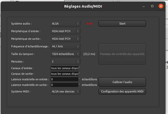Arrivé là, je choisis Alsa ou Jack en tant que système audio,je laisse le reste tel quel et je presse "start". dans les deux cas, j'ai une fenêtre d'erreur.