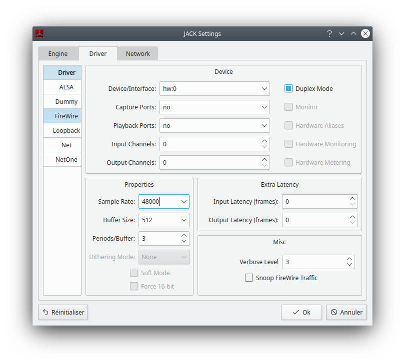 Une fois FFADOmixer démarré, tente de démarrer Jack sur le pilote firewire avec la bonne fréquence d'échantillonnage et renvoie nous les logs pour voir.