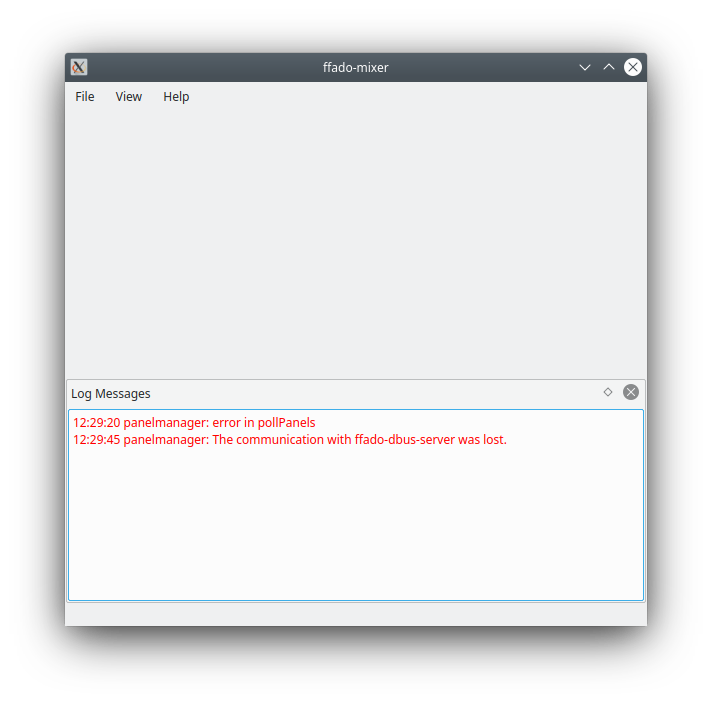 ~~#F00:00337135268: ~~#F00:Error (dice_avdevice.cpp)[1752] readReg: Could not read from node 0xFFC0 addr 0xFFFFE000008C~~ ~~ 12:29:20 panelmanager ERROR error in pollPanels 12:29:45 panelmanager ERROR The communication with ffado-dbus-server was lost. Traceback (most recent call last): File "/usr/share/ffado-mixer-qt4/ffado/panelmanager.py", line 154, in pollPanels child.polledUpdate() File "/usr/share/ffado-mixer-qt4/ffado/mixer/globalmixer.py", line 186, in polledUpdate self.refreshSampleRates(); File "/usr/share/ffado-mixer-qt4/ffado/mixer/globalmixer.py", line 106, in refreshSampleRates n_rates = self.samplerateselect.count() File "/usr/share/ffado-mixer-qt4/ffado/dbus_util.py", line 431, in count return self.iface.count() File "/usr/lib/python3/dist-packages/dbus/proxies.py", line 141, in __call__ return self._connection.call_blocking(self._named_service, File "/usr/lib/python3/dist-packages/dbus/connection.py", line 652, in call_blocking reply_message = self.send_message_with_reply_and_block( dbus.exceptions.DBusException: org.freedesktop.DBus.Error.NoReply: Did not receive a reply. Possible causes include: the remote application did not send a reply, the message bus security policy blocked the reply, the reply timeout expired, or the network connection was broken. During handling of the above exception, another exception occurred: Traceback (most recent call last): File "/usr/share/ffado-mixer-qt4/ffado/panelmanager.py", line 207, in commCheck nbDevices = self.devmgr.getNbDevices() File "/usr/share/ffado-mixer-qt4/ffado/dbus_util.py", line 327, in getNbDevices return self.iface.getNbElements() File "/usr/lib/python3/dist-packages/dbus/proxies.py", line 141, in __call__ return self._connection.call_blocking(self._named_service, File "/usr/lib/python3/dist-packages/dbus/connection.py", line 652, in call_blocking reply_message = self.send_message_with_reply_and_block( dbus.exceptions.DBusException: org.freedesktop.DBus.Error.NoReply: Did not receive a reply. Possible causes include: the remote application did not send a reply, the message bus security policy blocked the reply, the reply timeout expired, or the network connection was broken. During handling of the above exception, another exception occurred: Traceback (most recent call last): File "/usr/share/ffado-mixer-qt4/ffado/panelmanager.py", line 157, in pollPanels self.commCheck() File "/usr/share/ffado-mixer-qt4/ffado/panelmanager.py", line 214, in commCheck for panel in keys: RuntimeError: dictionary changed size during iteration