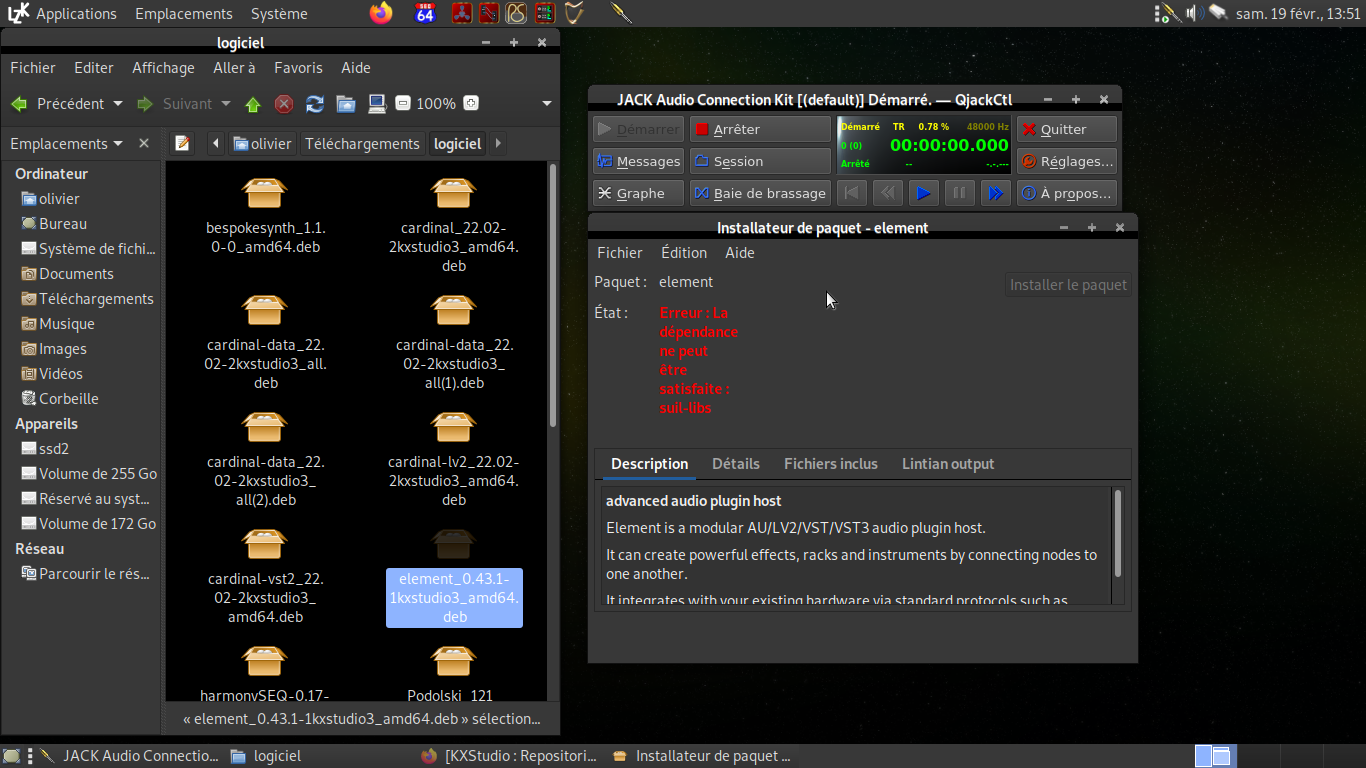 j'essaye d'installer sous librazik Element qui est un hôte de greffons qu'on peut trouver à télécharger sur la page repositories de KX Studio : https://kx.studio/Repositories:Applications car il intègre une fonctionnalité assez unique que j'aimerais tester.