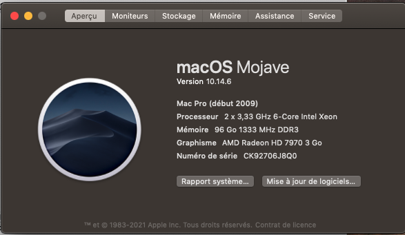 Depuis peu j'ai un Mac Pro de 2009, bi-Xeon avec 96 Go de ram une Radeon HD 7970: