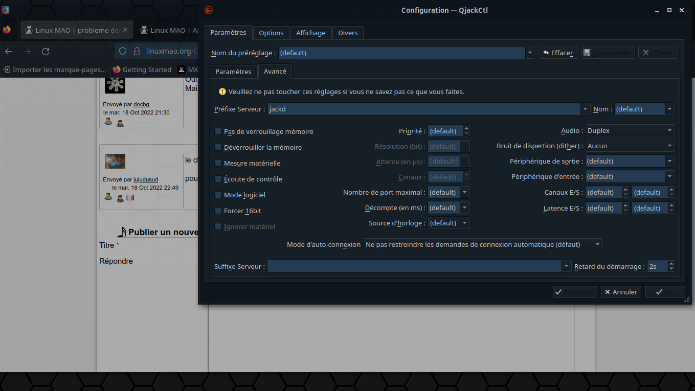 Qjack n'arrive pas à démarrer jackd, et le message d'erreur est que la connection avec le server est impossible.