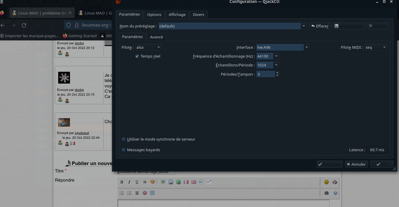 Est ce que tu peux faire des captures d'écran de tes réglages dans QJackCtl ?