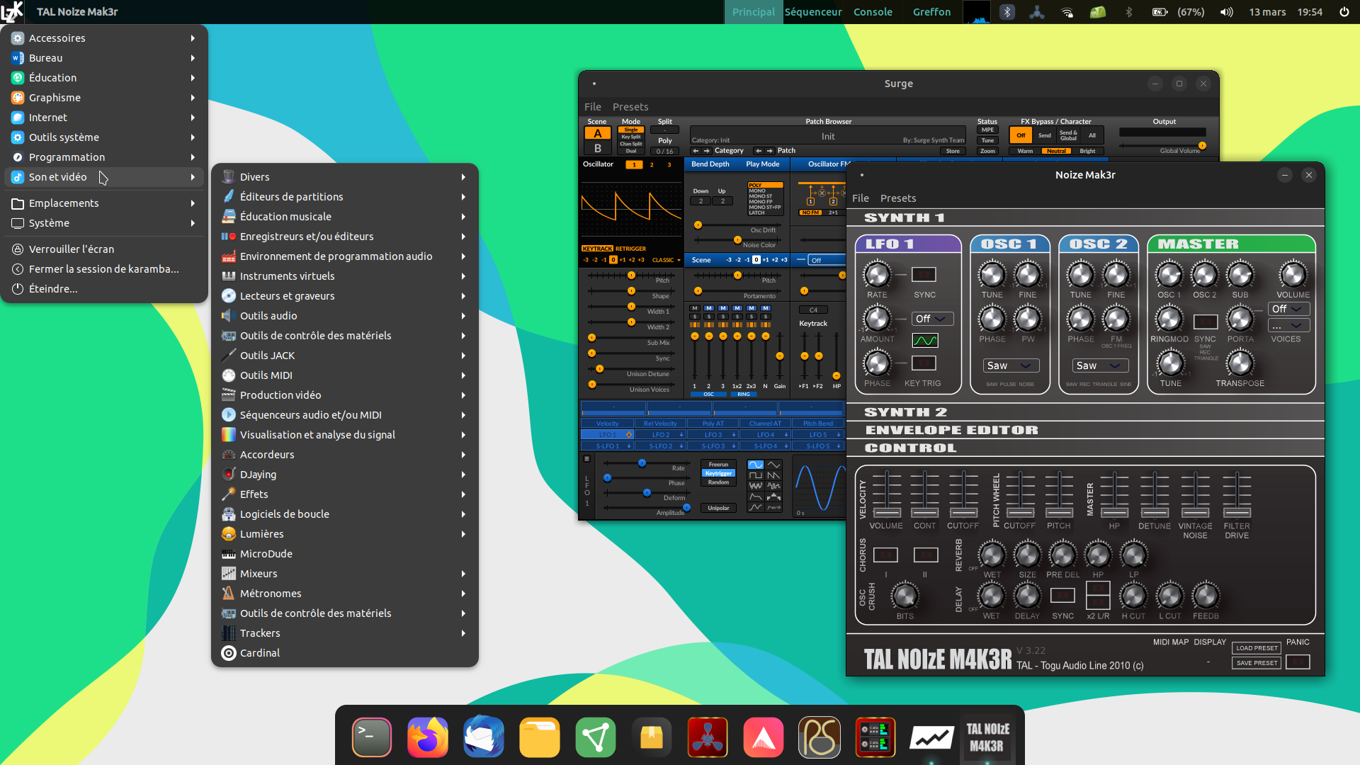 - ajout de 4 espaces de travail ( Principal/Séquenceur/Console/Greffon). Avec devilspie ( https://doc.ubuntu-fr.org/devilspie ), j'ai paramétré de façon à ce que chaque principaux logiciels que j'utilise s'ouvre directement dans les différents espaces de travail. Et dans mon cas, c'est très pratique.