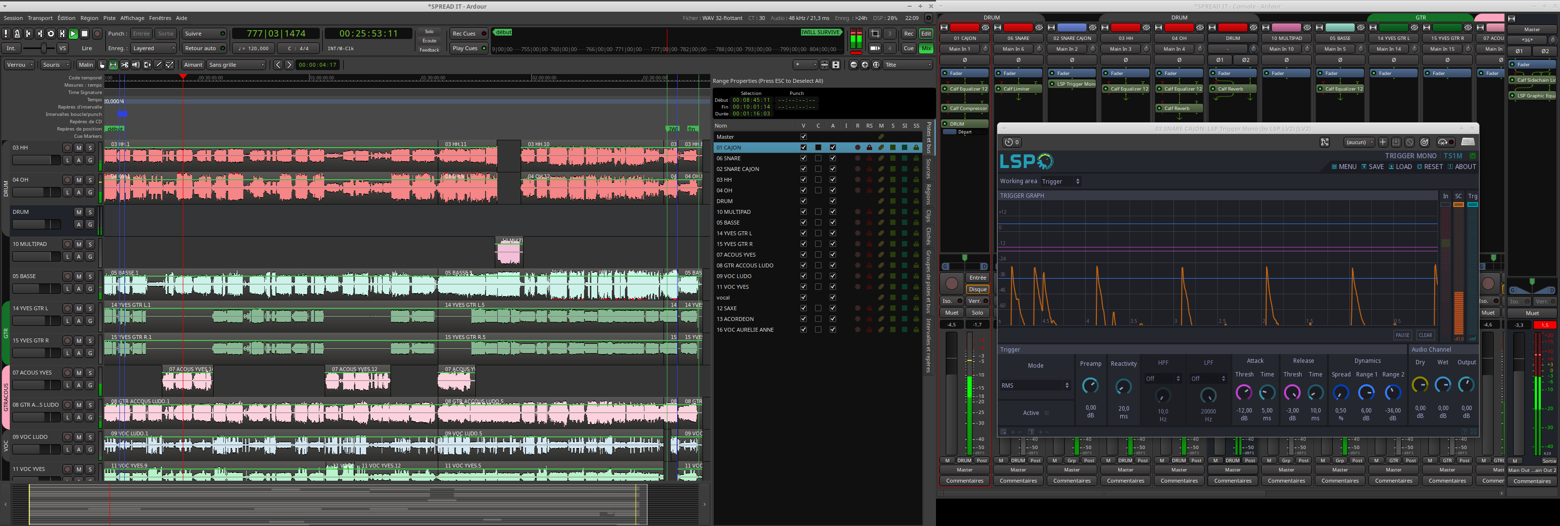 Je n'ai pas de plugin VST,d'apres UNFA (maitre ardour sur youtube) il y a tous ce qu'il faut sur LV2 et LAPSA. J'ai trouvé onsetrigger mais cela ne fonctionne pas du tout.