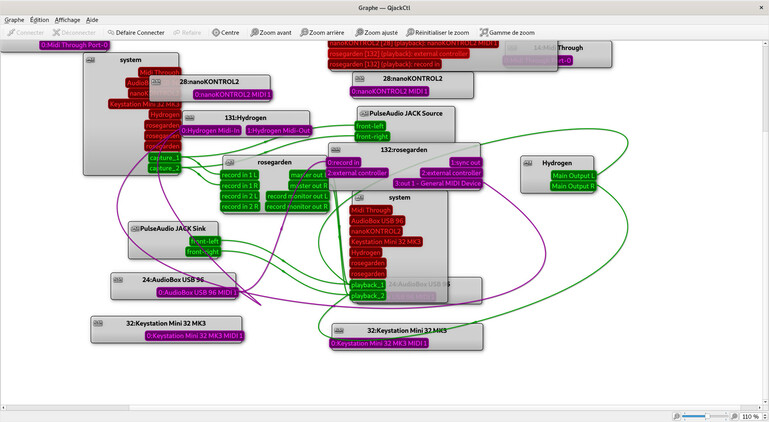 J'avais réussi à enregistrer une ligne de percussions jouée sur Hydrogen sur une piste de Rosegarden en paramétrant JACK via QJackctl et les logiciels via leurs options respectives.