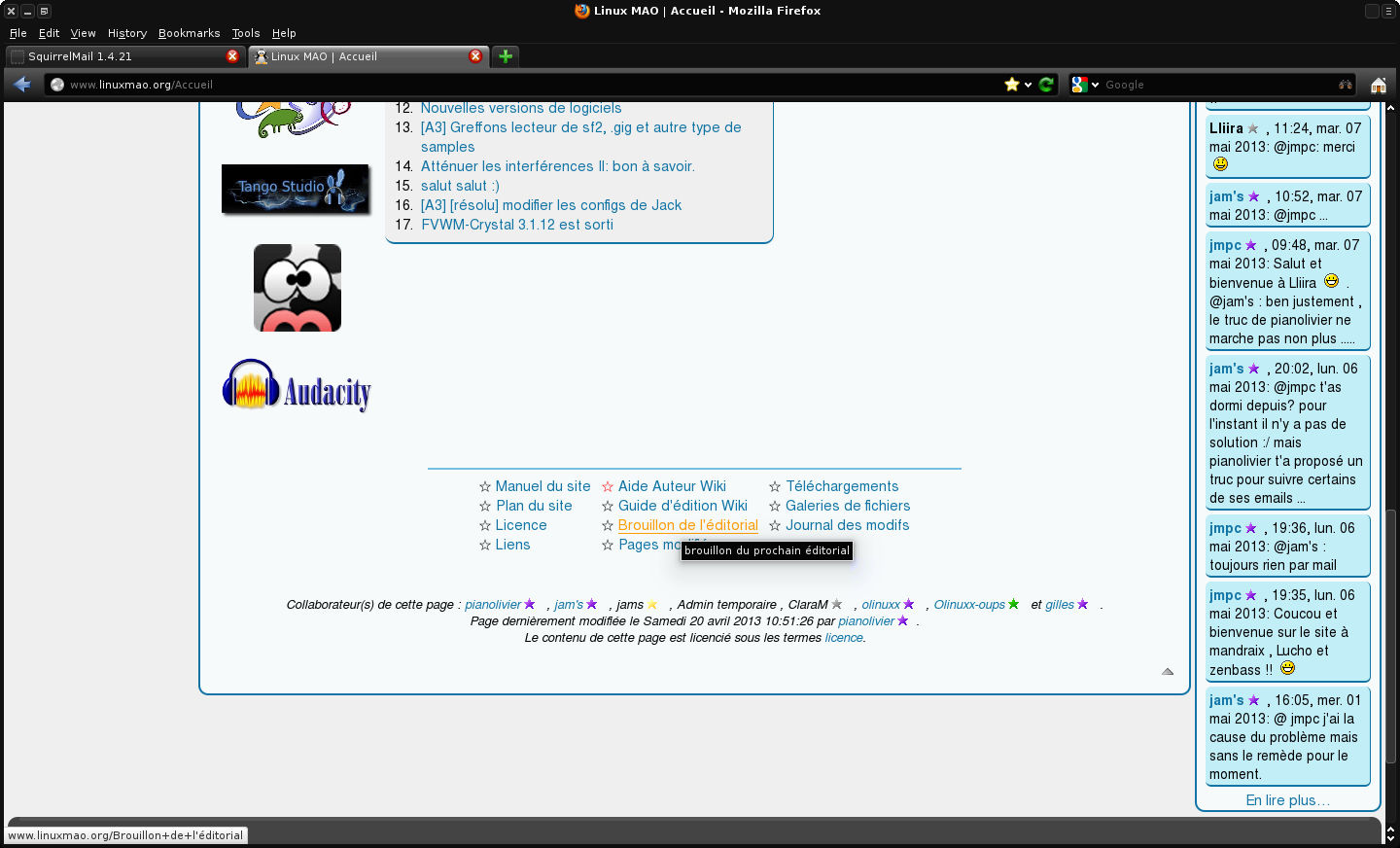 Envoyé par ycollet le Samedi 11 mai 2013 09:35 Merci pour l'info. Les liens que j'aimerai voir apparaître dans le menu Mon Linux MAO: Les logiciels libres actifs: logiciels+libres+actifs Les logiciels libres en développement: logiciels+libres+en+d%C3%A9veloppement Le brouillon de l'édito: Brouillon+de+l%27%C3%A9ditorial Bon WE, YC