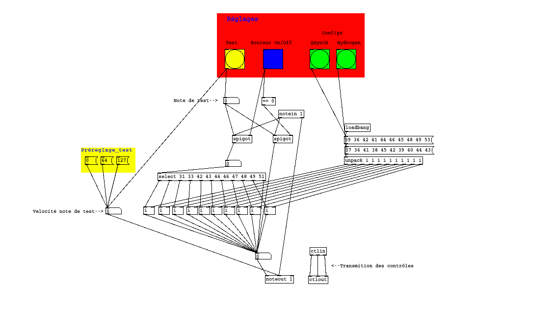 J'utilise QmidiRoute pour adapter la drum map de ma batterie à la drum map d'hydrogen. J'ai créer un fichier midi route pour pouvoir rapidement installer l'ensemble pour jouer en live. J'utilse des route du type :