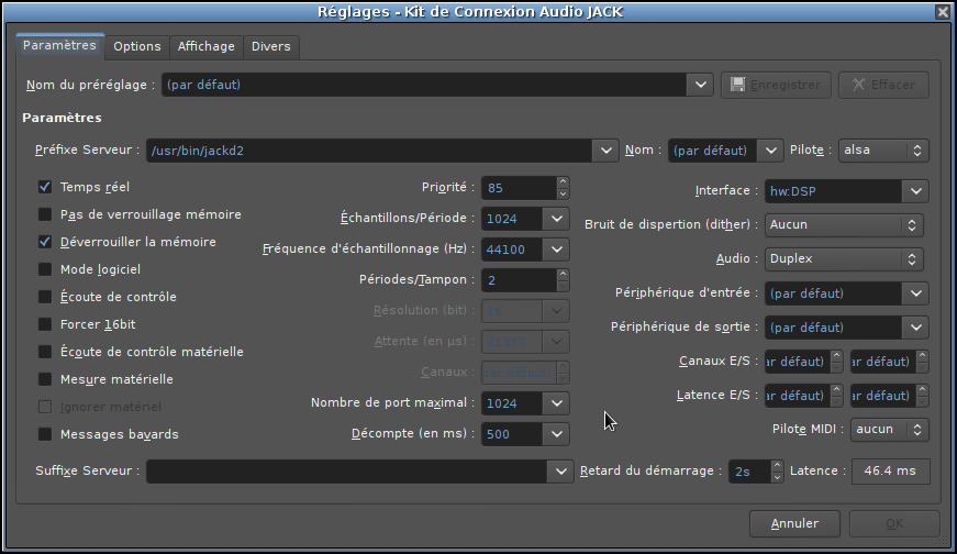 autre détail: avec un kernel low-latency (par exemple sur kxstudio), j'obtenais une latence de 11,6 si je me souviens bien. c'est pas optimal (car ma carte peut prendre bien meilleur résultat), mais c'est déjà ça.