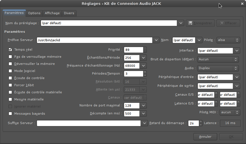Je vais dans Qjackctl onglet Alsa pour connecter le pedalier, ça crachote, ça plante et sifflement dans les HP. obligé de débrancher la carte, de fermer sooperlooper qui est planté et de couper Jack (qui a du mal à s'arrêter).