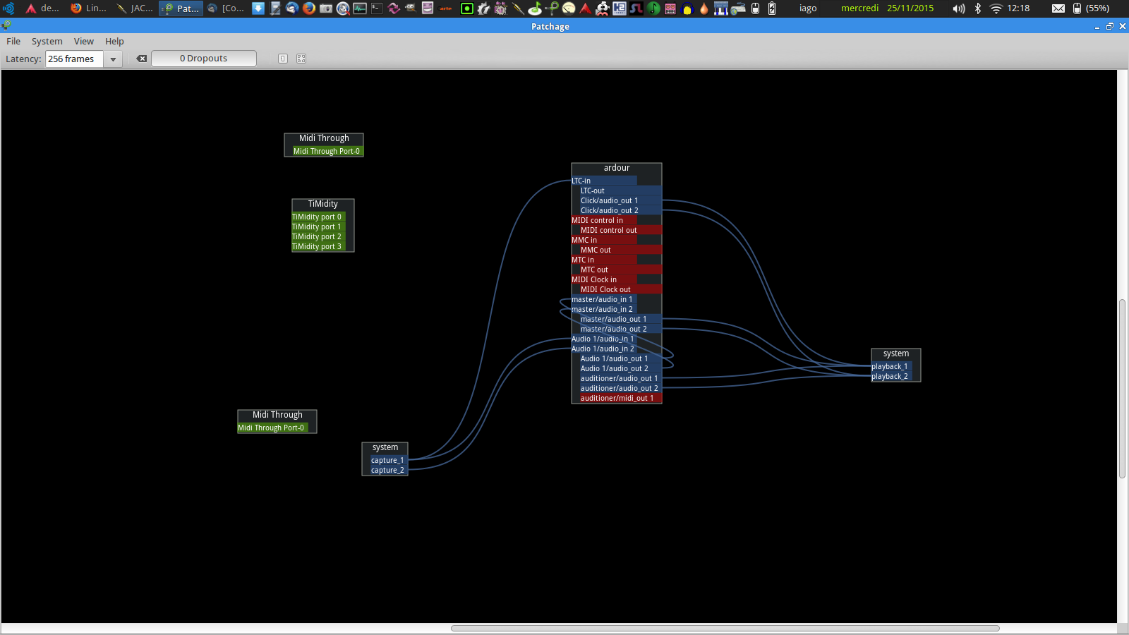 Donc si tu choisi Qjackctl et jack-session ça risque d'être pénible mais bon chacun voi midi à sa porte perso j'aime les chose avec des boutons à cliquer par contre je te recommande vivement une installation en dur ubuntu studio/kXstudio ou même une debian jessie avec intégration des dépôts de la KXSTudio pour intégration complète de cadence+claudia (claudia étant une version similaire à gladish mais ce dernier n'a pas été retouche depuis belles lurettes.