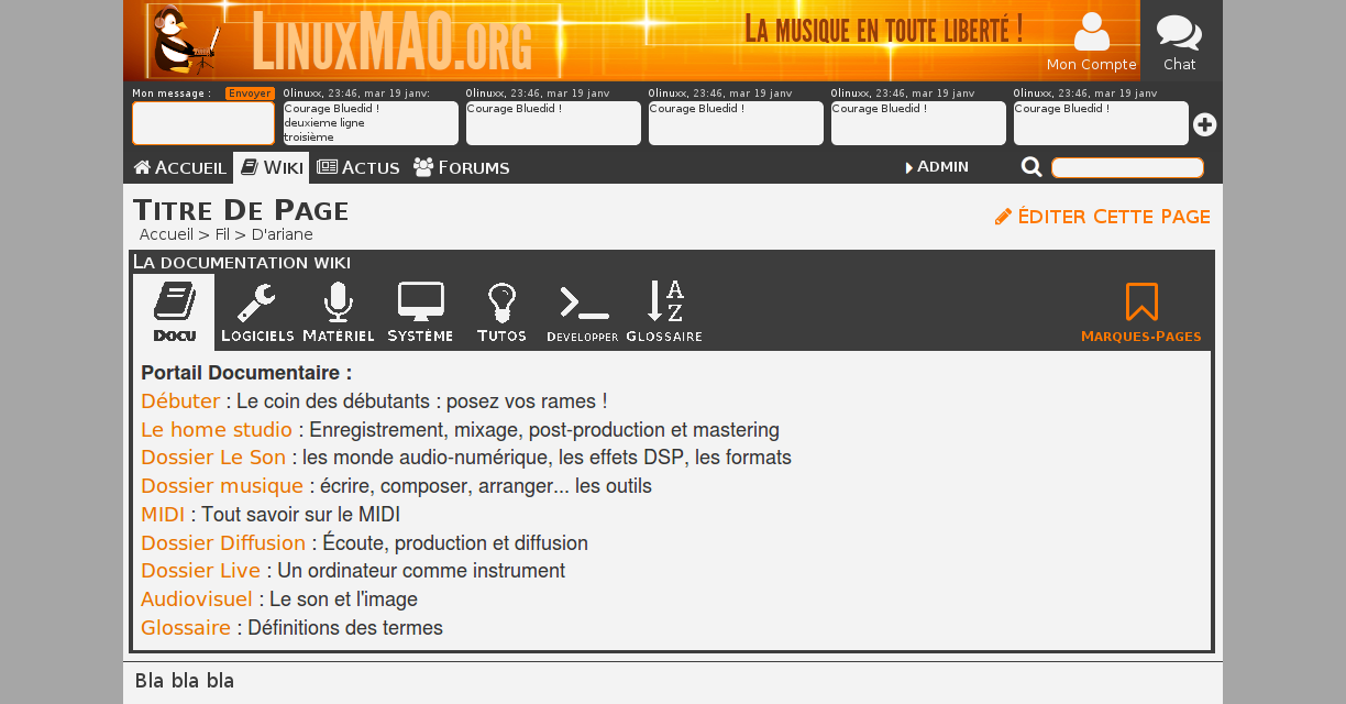 Dans la capture d'écran précédente (ce n'est qu'un exemple), on peut voir le menu wiki en "tabulation" (docu, logiciels, matos...).