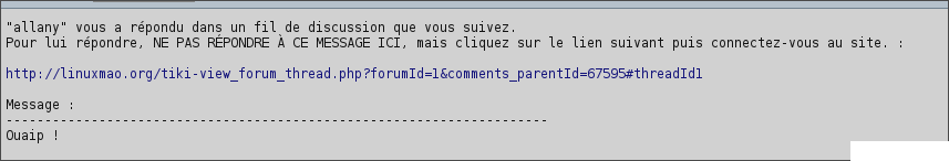 Il y a fréquemment des utilisateurs qui répondent directement à ce courriel dans leur boîte perso (pas la messagerie interne de linuxmao hein, je parle ici de leur boîte perso à l'adresse renseignée dans leurs préférences MonLinuxmao). Ce qui fait que ce message est reçu sur l'adresse info HATTE linuxmao POINGT org et qu'il n'y en a aucune trace sur le site.
