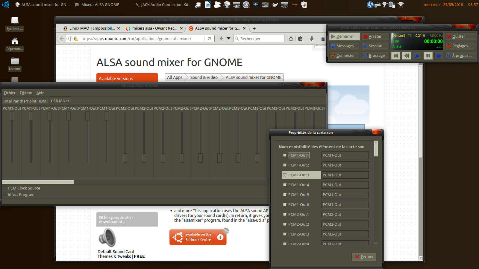 Ici, j'ai clairement un problème de compatibilité de librairies (jackd2, version Ubuntu,...) pour installer les mixers cités, hors paquets Ubuntu.
