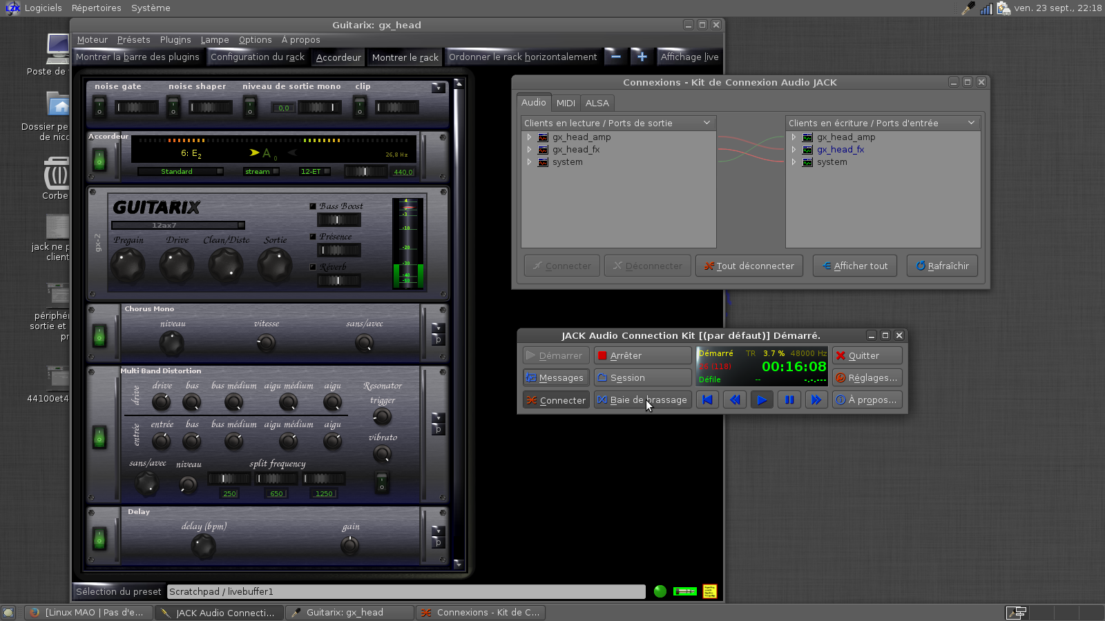 Avant d'aller bêcher dans guitarix, il faut absolument que ton jackd fonctionne sans faillir.