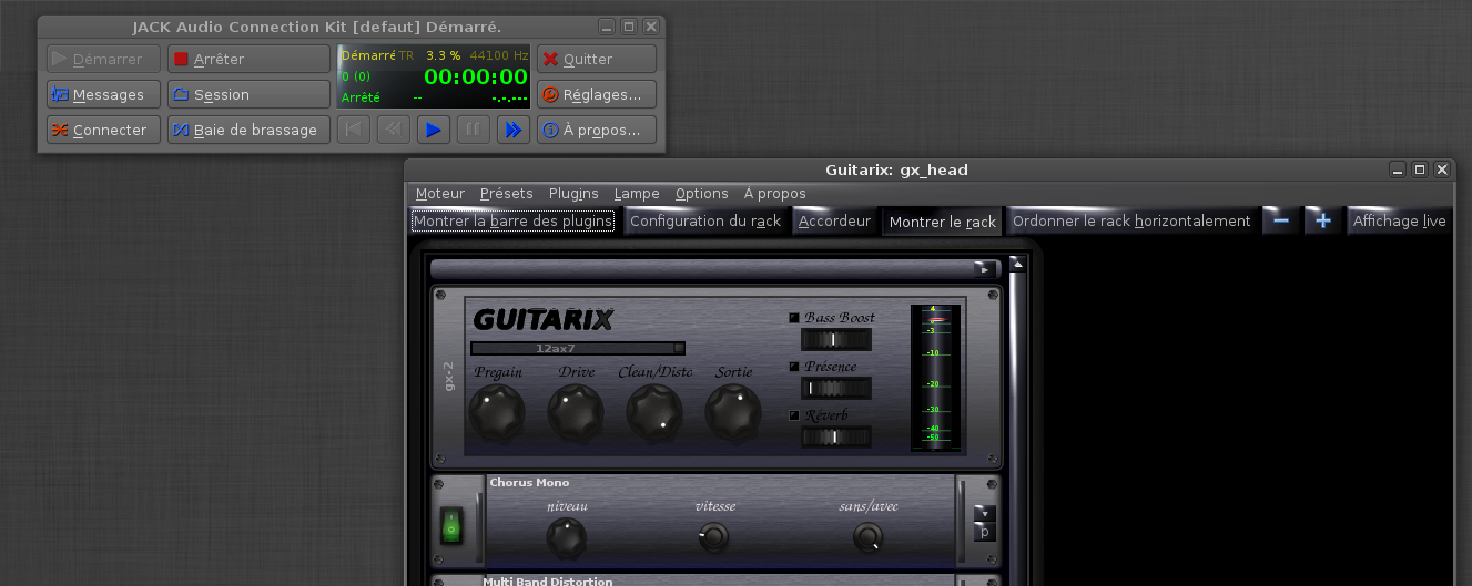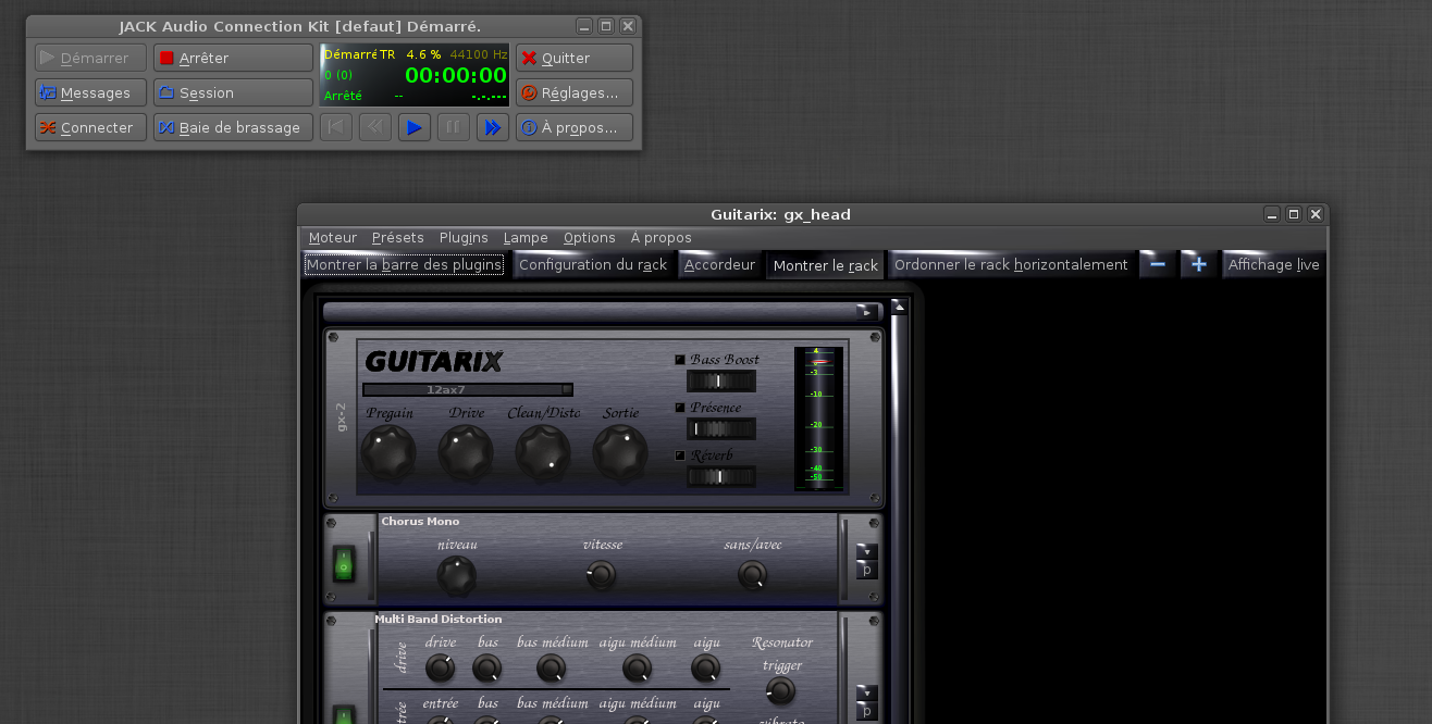 Ce que tu peux faire, si le coup du niveau monitor ne donne rien, pour t' assurer du fonctionnement de Jack c' est fermer tous tes softs audio et relier directement les system/captures vers les system/playbacks. En faisant ça tu relies virtuellement l' entrée vers la sortie donc si tu joues avec ta gratte branchée tu dois entendre directement le son brut sur tes enceintes (avec la latence induite par Jack mais on verra après si on peu l' optimiser et la réduire si c' est inconfortable). Si cette manip' fonctionne, que t' as bien le son brut qui sort, c' est que Jack fonctionne correctement dans les deux sens, et que donc ton problème est du côté de guitarix. Si tu ne récupères rien dans les enceintes c' est que même si jack se lance ya encore un os qquepart, et c' est pas la peine d' essayer n' importe quel soft, rien ne marchera.