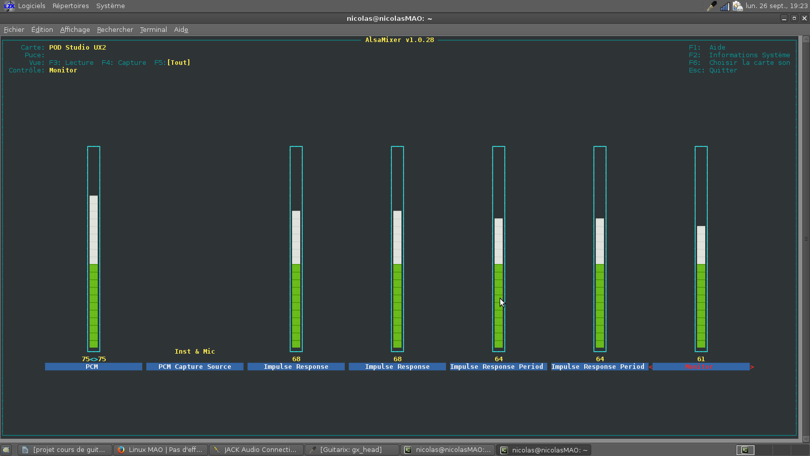 Je suis allé dans alsamixer, J'ai donc monté le curseur du monitor du POD UX2( au fait c'est vrai qu'est ce que c'est le monitor ? Je l'avais mis à zéro parce qu'on m'a dit deux fois de le couper)