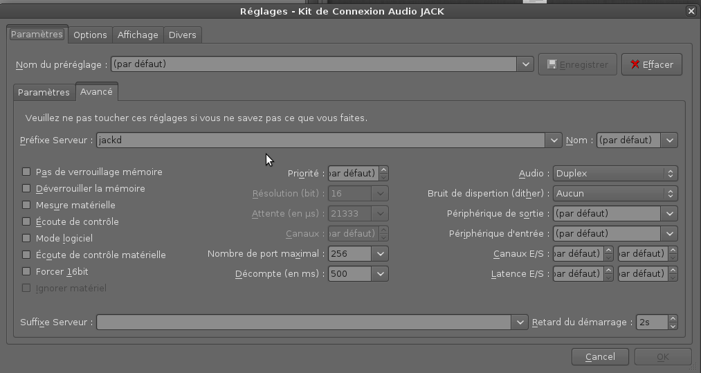 • Le serveur Jack est configuré avec dans les réglages avancés de QjackCtl :