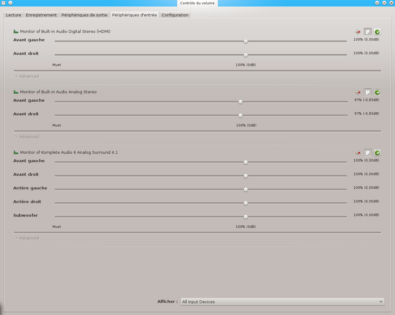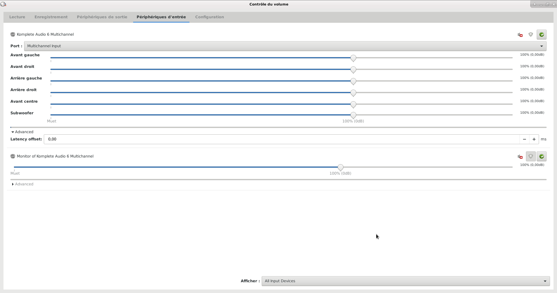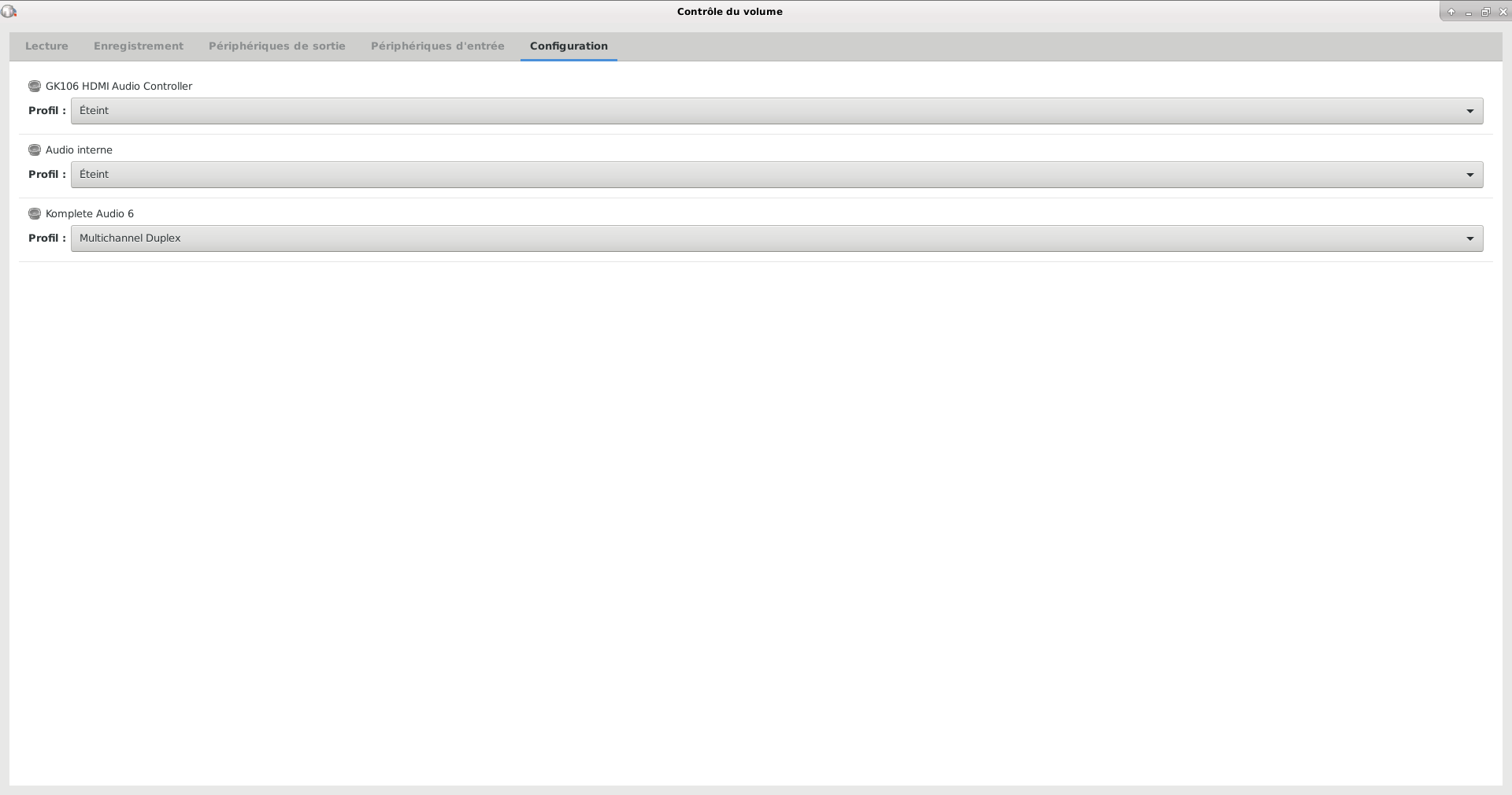 [alamo@localhost ~]$ __aplay -l__ **** List of PLAYBACK Hardware Devices **** card 0: HDMI [HDA Intel HDMI], device 3: HDMI 0 [HDMI 0] Subdevices: 1/1 Subdevice #0: subdevice #0 card 0: HDMI [HDA Intel HDMI], device 7: HDMI 1 [HDMI 1] Subdevices: 1/1 Subdevice #0: subdevice #0 card 1: PCH [HDA Intel PCH], device 0: ALC892 Analog [ALC892 Analog] Subdevices: 0/1 Subdevice #0: subdevice #0 card 1: PCH [HDA Intel PCH], device 3: ALC892 Digital [ALC892 Digital] Subdevices: 1/1 Subdevice #0: subdevice #0 card 3: K6 [Komplete Audio 6], device 0: USB Audio [USB Audio] Subdevices: 1/1 Subdevice #0: subdevice #0 [alamo@localhost ~]$