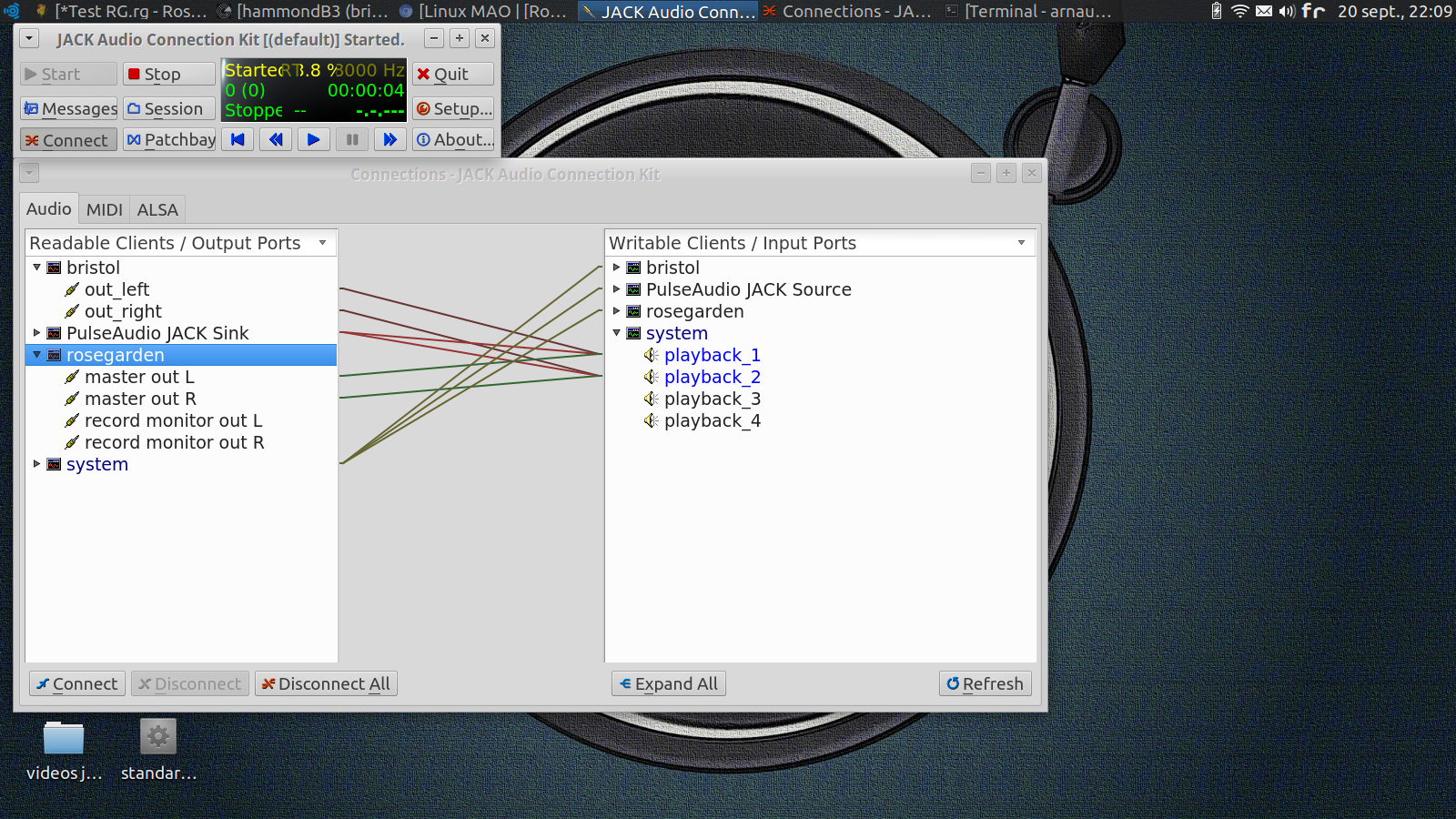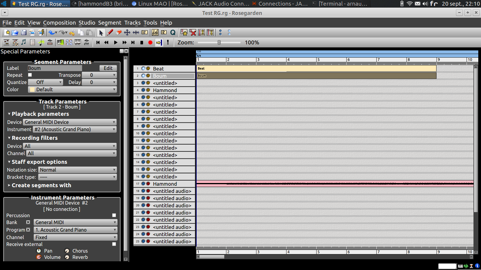 est ce que tu peux nous donner une capture d'écran de rosgarden ainsi que de tes connexions dans jack s'il te plait ?