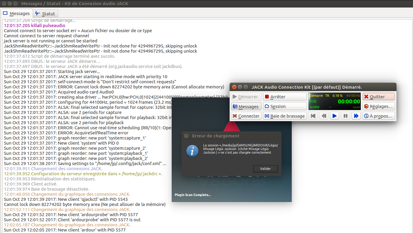 16:59:14.825 Réinitialisation des statistiques. 16:59:14.874 Changement des connexions ALSA. 16:59:14.879 DBUS : le service est disponible (org.jackaudio.service soit jackdbus). Cannot connect to server socket err = Aucun fichier ou dossier de ce type Cannot connect to server request channel jack server is not running or cannot be started JackShmReadWritePtr::~JackShmReadWritePtr - Init not done for 4294967295, skipping unlock JackShmReadWritePtr::~JackShmReadWritePtr - Init not done for 4294967295, skipping unlock 16:59:14.983 Changement du graphique des connexions ALSA. 16:59:18.324 Script de démarrage... 16:59:18.325 killall pulseaudio Cannot connect to server socket err = Aucun fichier ou dossier de ce type Cannot connect to server request channel jack server is not running or cannot be started JackShmReadWritePtr::~JackShmReadWritePtr - Init not done for 4294967295, skipping unlock JackShmReadWritePtr::~JackShmReadWritePtr - Init not done for 4294967295, skipping unlock 16:59:18.732 Script de démarrage terminé avec succès. 16:59:18.779 DBUS : impossible de démarrer le serveur JACK. Désolé Sat Oct 28 16:59:18 2017: Starting jack server... Sat Oct 28 16:59:18 2017: JACK server starting in realtime mode with priority 10 Sat Oct 28 16:59:18 2017: self-connect-mode is "Don't restrict self connect requests" Sat Oct 28 16:59:18 2017: ERROR: Cannot lock down 82274202 byte memory area (Cannot allocate memory) Sat Oct 28 16:59:18 2017: ERROR: cannot register object path "/org/freedesktop/ReserveDevice1/Audio0": A handler is already registered for /org/freedesktop/ReserveDevice1/Audio0 Sat Oct 28 16:59:18 2017: ERROR: Failed to acquire device name : Audio0 error : A handler is already registered for /org/freedesktop/ReserveDevice1/Audio0 Sat Oct 28 16:59:18 2017: ERROR: Audio device hw:PCH,0 cannot be acquired... Sat Oct 28 16:59:18 2017: ERROR: Cannot initialize driver Sat Oct 28 16:59:18 2017: ERROR: JackServer::Open failed with -1 Sat Oct 28 16:59:18 2017: ERROR: Failed to open server Sat Oct 28 16:59:19 2017: Saving settings to "/home/jp/.config/jack/conf.xml" ... 16:59:44.285 Impossible de connecter le serveur JACK comme client. - L'opération a échoué. - Incapable de se connecter au serveur. Veuillez consulter la fenêtre des messages pour plus d'informations. Cannot connect to server socket err = Aucun fichier ou dossier de ce type Cannot connect to server request channel jack server is not running or cannot be started JackShmReadWritePtr::~JackShmReadWritePtr - Init not done for 4294967295, skipping unlock JackShmReadWritePtr::~JackShmReadWritePtr - Init not done for 4294967295, skipping unlock
