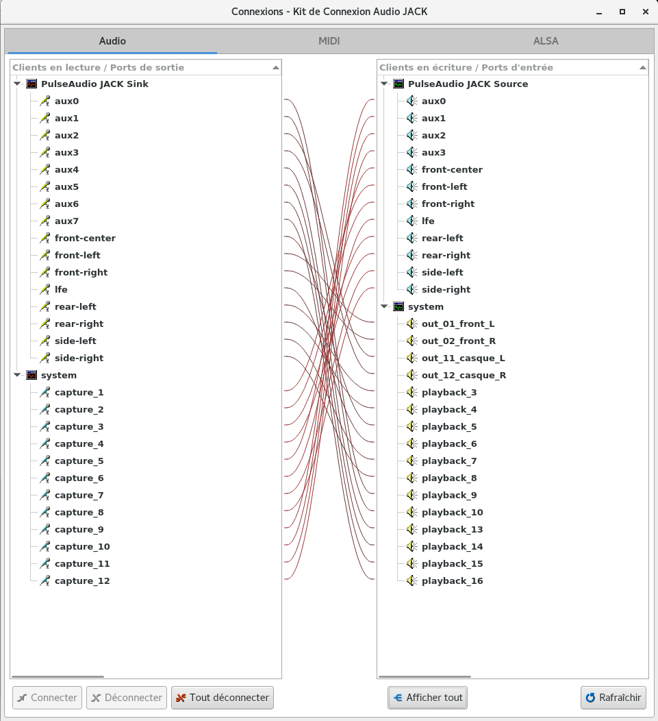 J'ai suivi un tuto pour pouvoir démarrer qjactl sans les connexions par défaut. mais rien n'y fait, toujours mon plat de spaghettis dès que j'ouvre la fenêtre "connecter". (Ça passe sur ma focusrite2i4, mais avec la rme hdsp9632 avec quatre sorties supplémentaire... C'est une indigestion directe (spaghettis;)). Bref, quand je rappel une session, que je l'active il ne se passe rien, même si je fait tout déconnecter avant.