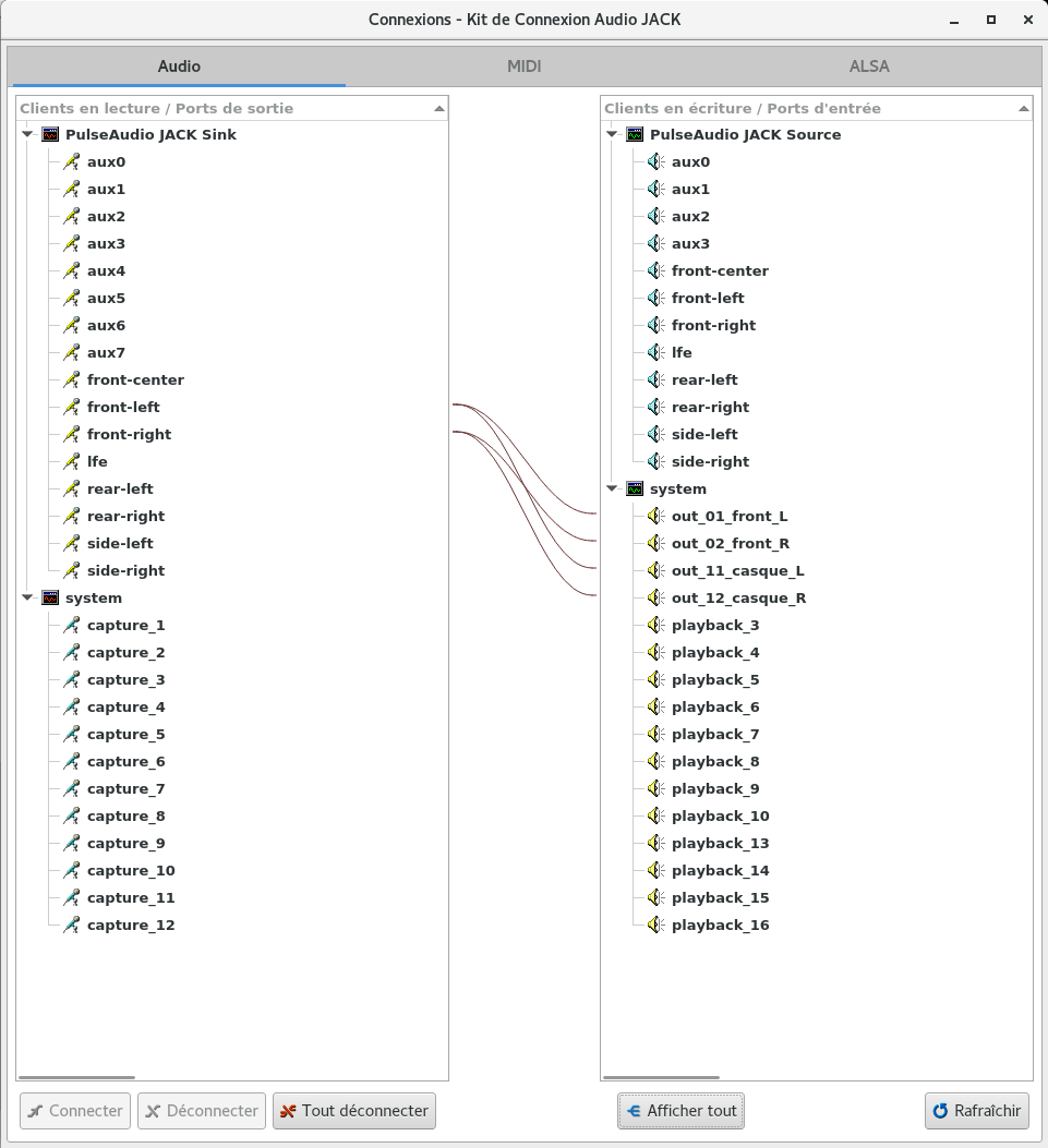 Je sèche sur qjackctl pour utiliser les sessions et la baie de brassage, surtout pour rappeler mes essais de configurations.