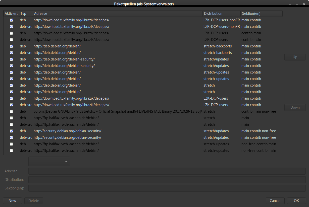 # # deb cdrom:[Debian GNU/Linux 9 _Stretch_ - Official Snapshot amd64 LIVE/INSTALL Binary 20171028-18:36]/ stretch contrib main non-free #d eb cdrom:[Debian GNU/Linux 9 _Stretch_ - Official Snapshot amd64 LIVE/INSTALL Binary 20171028-18:36]/ stretch contrib main non-free deb http://ftp.halifax.rwth-aachen.de/debian/ stretch main deb-src http://ftp.halifax.rwth-aachen.de/debian/ stretch main # auskommentiert, um Fehlermeldung wegzukriegen deb http://security.debian.org/debian-security stretch/updates main contrib non-free deb-src http://security.debian.org/debian-security stretch/updates main contrib non-free # stretch-updates, previously known as 'volatile' deb http://ftp.halifax.rwth-aachen.de/debian/ stretch-updates main contrib non-free deb-src http://ftp.halifax.rwth-aachen.de/debian/ stretch-updates main contrib non-free