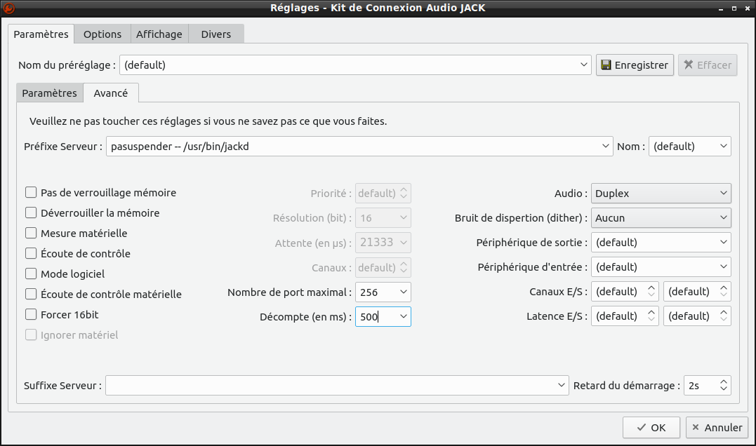 - Pour avoir le son des différentes applications en plus du serveur Jack qui marche : **avoir installé pulseaudio-module-jack