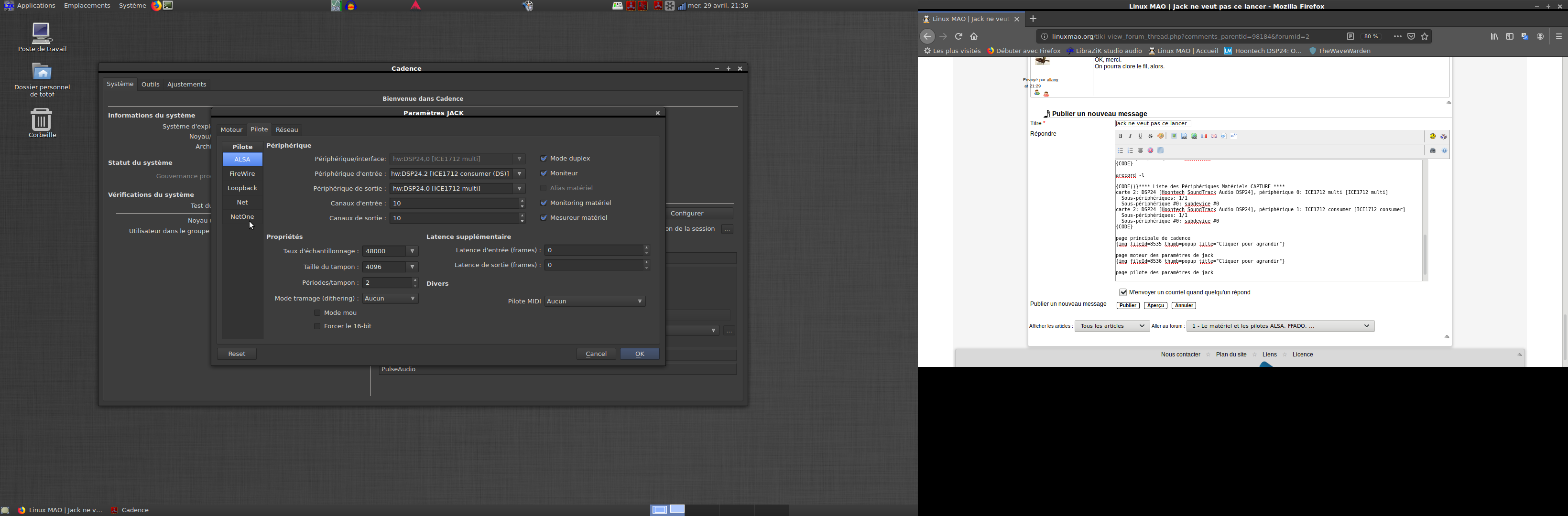 Sat Apr 25 21:49:39 2020: Starting jack server... Sat Apr 25 21:49:39 2020: JACK server starting in realtime mode with priority 80 Sat Apr 25 21:49:39 2020: self-connect-mode is "Don't restrict self connect requests" Sat Apr 25 21:49:39 2020: Acquired audio card Audio1 Sat Apr 25 21:49:39 2020: creating alsa driver ... hw:DSP24,0|hw:DSP24,2|128|2|48000|10|10|hwmon|hwmeter|-|32bit Sat Apr 25 21:49:39 2020: ERROR: ALSA: Cannot open PCM device alsa_pcm for capture. Falling back to playback-only mode Sat Apr 25 21:49:39 2020: configuring for 48000Hz, period = 128 frames (2.7 ms), buffer = 2 periods Sat Apr 25 21:49:39 2020: ALSA: final selected sample format for playback: 32bit integer little-endian Sat Apr 25 21:49:39 2020: ALSA: use 2 periods for playback Sat Apr 25 21:49:43 2020: ERROR: ALSA: poll time out, polled for 3999032 usecs Sat Apr 25 21:49:43 2020: ERROR: JackAudioDriver::ProcessAsync: read error, stopping... Sat Apr 25 21:49:44 2020: ERROR: JackPosixProcessSync::LockedTimedWait error usec = 5000000 err = Connection timed out Sat Apr 25 21:49:44 2020: ERROR: Driver is not running Sat Apr 25 21:49:44 2020: ERROR: Cannot open client name = dbusapi Sat Apr 25 21:49:44 2020: ERROR: failed to create dbusapi jack client Sat Apr 25 21:49:44 2020: Released audio card Audio1